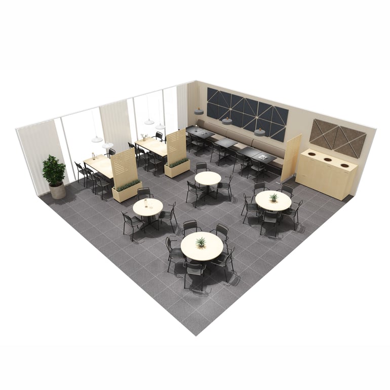 Kui söögiruumi kasutavad iga päev paljud tööriietes töötajad, peab mööbel taluma kulumist ning olema lihtsasti puhastatav. Iga detail on valitud selleks, et muuta ruumi kasutamine võimalikult mugavaks ja tõhusaks. Toolid saab tõsta laudade külge, et põranda puhastamine oleks lihtsam. Lauaplaadid on veekindlad ja taluvad igapäevast kasutust. Kunstnahast diivanid pakuvad mugavust ning on hõlpsasti hooldatavad. Kõik on loodud selleks, et tagada funktsionaalne ja kauakestev ruum.